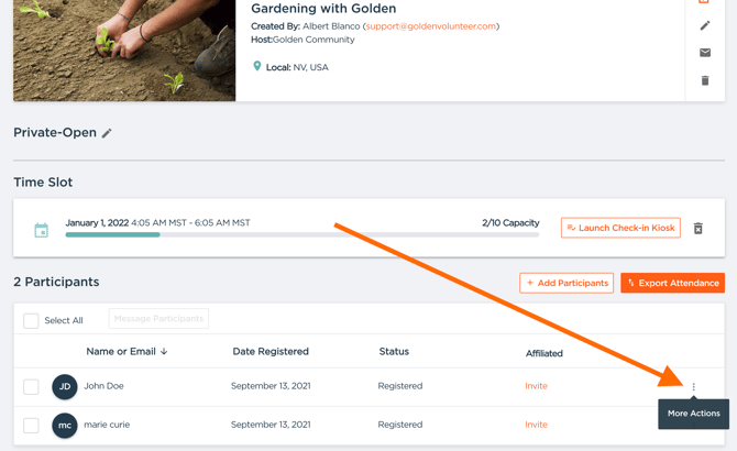 You can see the answers to the custom questions from an individual registration directly from the Opportunity management page. The Opportunity management page is found by clicking the link/title of the Opportunity from the My Opportunities tab. Once you are viewing the Opportunity registration details that has custom questions, you can use the three vertical dot menu on the "registration row" to open a menu that will allow you to either view the answers to the questions, or cancel the individual registration you are viewing.