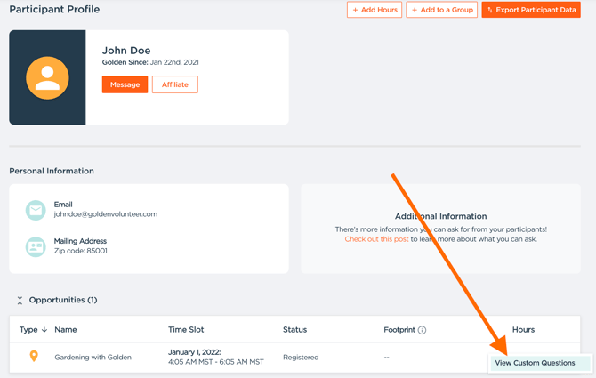 The Dashboard gives users multiple ways to see the submitted answers to the custom questions including: the participant profile, the Opportunity management page, and exports. This section will walk you through the three aforementioned ways to view the answers, and what the differences are.