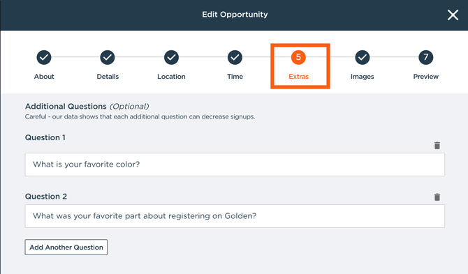 Although the Golden Dashboard allows you to collect many important data-points from volunteers in the Additional Information section of the Opportunity creation/edit process, we understand that there are times where you will want to ask one-off questions, or questions in a very customized way!