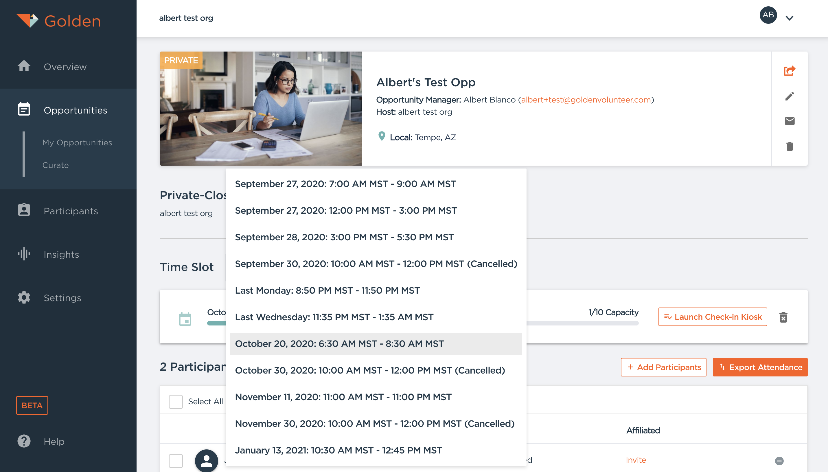 You can access past (or future) time slots via the drop-down menu at the top left of the page. This will display all volunteers either listed as Pending, Missed, Cancelled, or Completed.