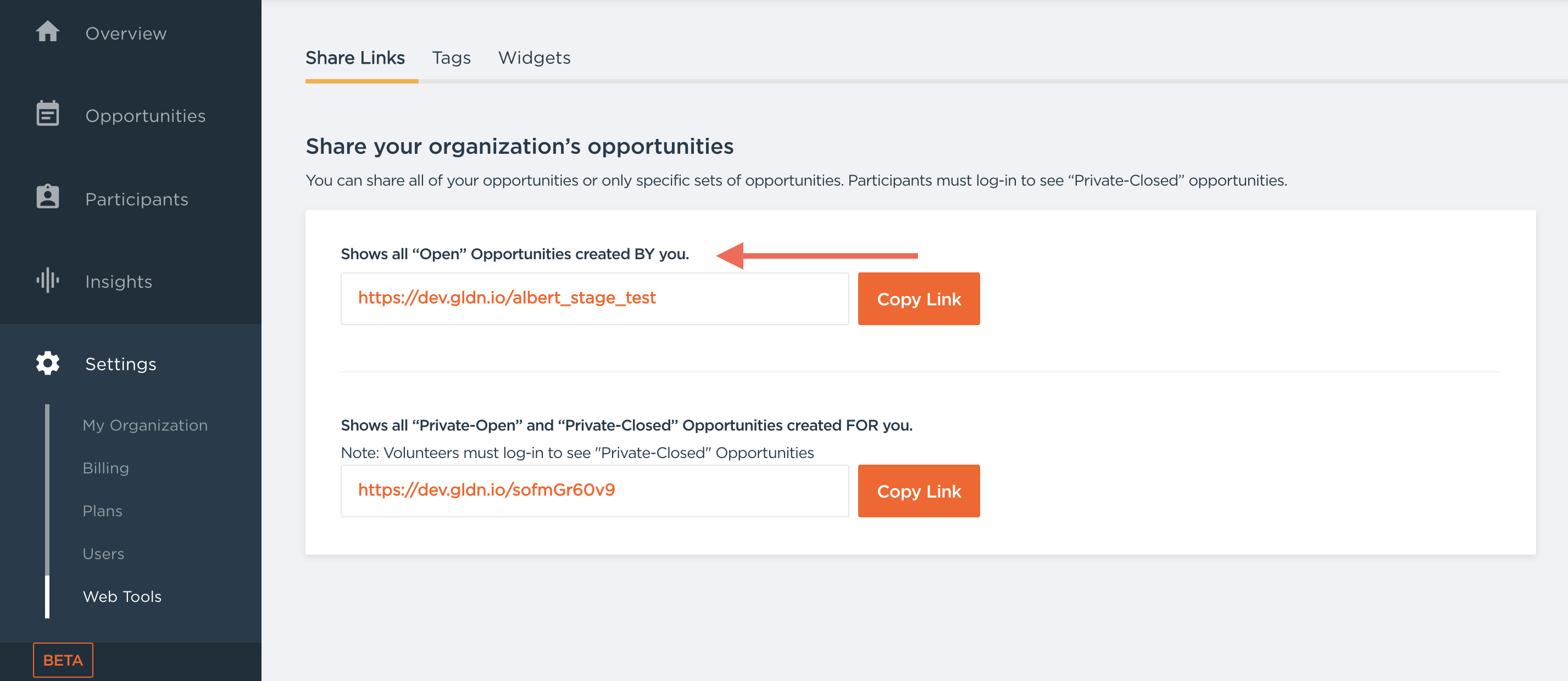 As well, you can easily Share every Opportunity you have created using the "Sharing Links" section in the Website Tools. This is a great way to display all of your upcoming Opportunities in one easy link. We recommend Sharing these on your Facebook Page, Website, E-mail, and Social Media.