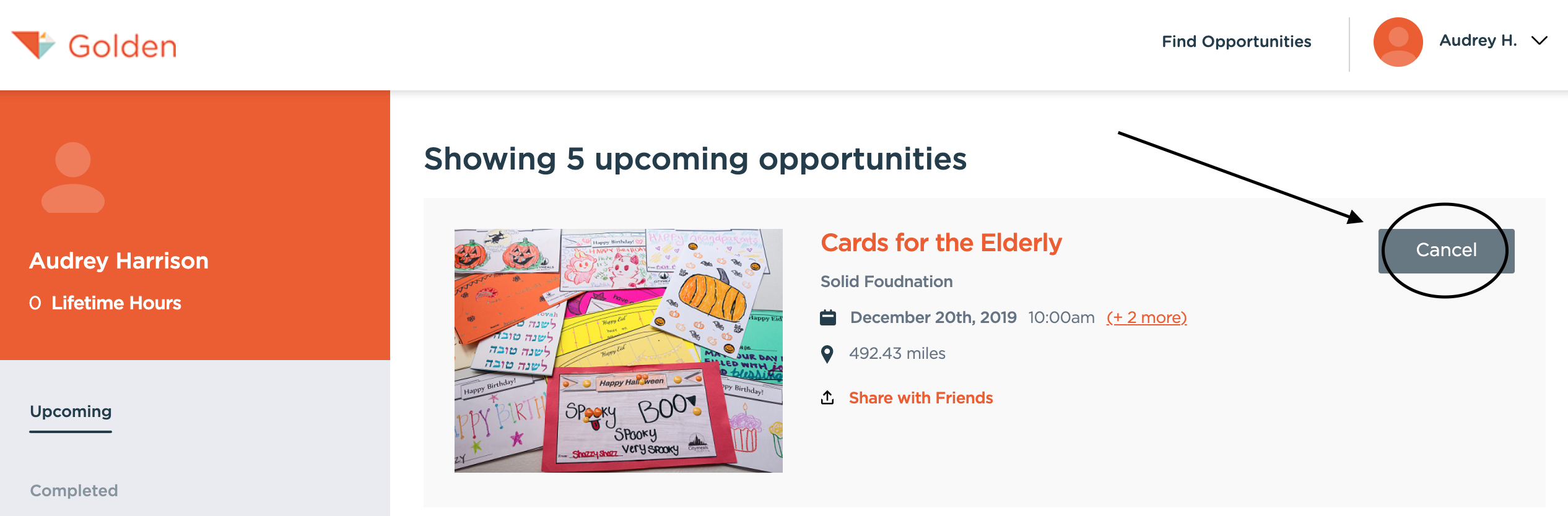 On a computer: Make sure you are logged into your Golden account, and select your name in the top right-hand corner. Select "My Opportunities" and then select "Cancel" for the specific opportunity you would like to unregister for.