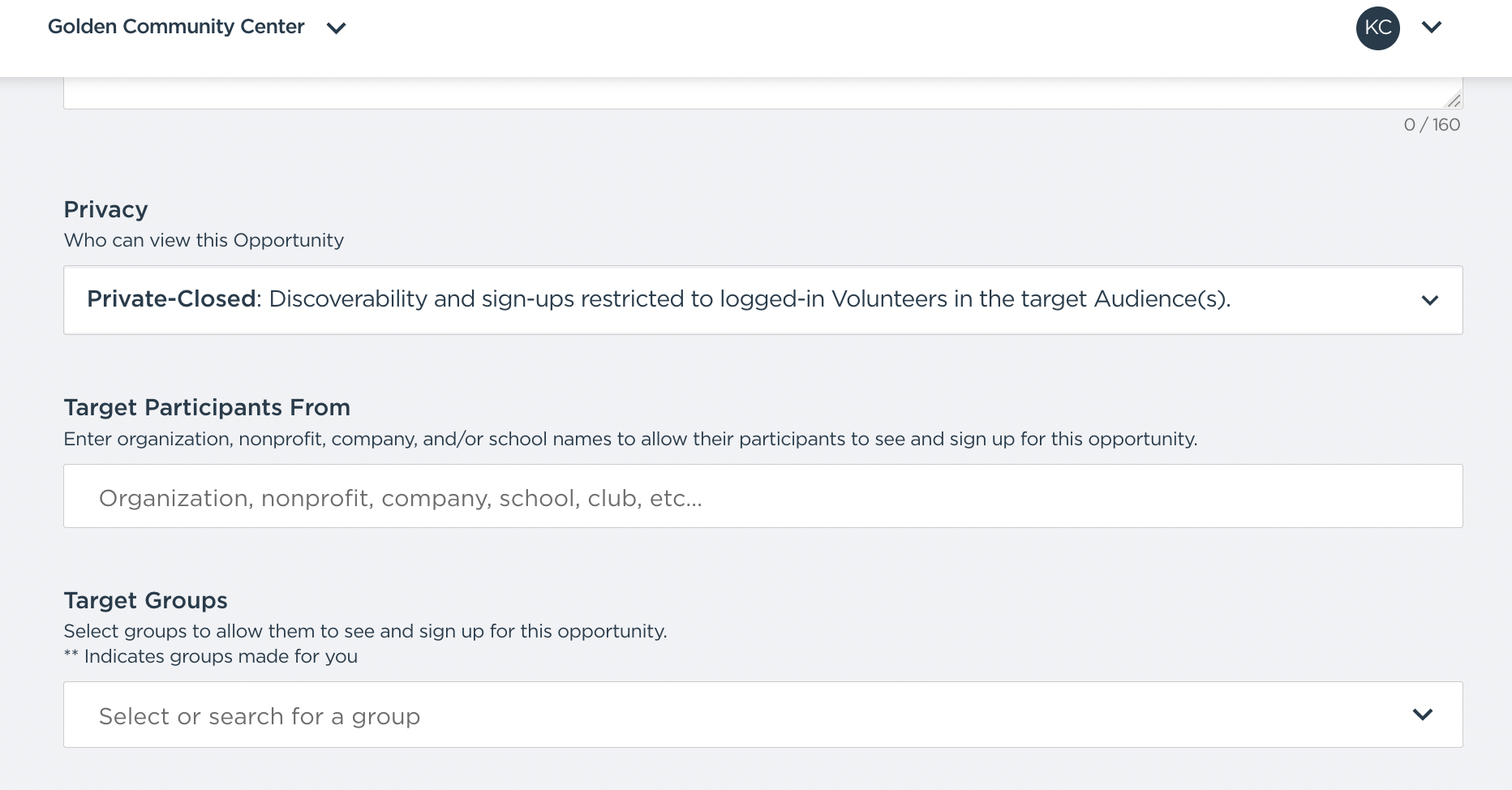 When you create your Orientation, Training, Interview (or whatever comes next!), set the "Audience" to "Private-Closed" and the Target Group is the "**Completed [whatever you titled the application Opportunity]" Group mentioned above.