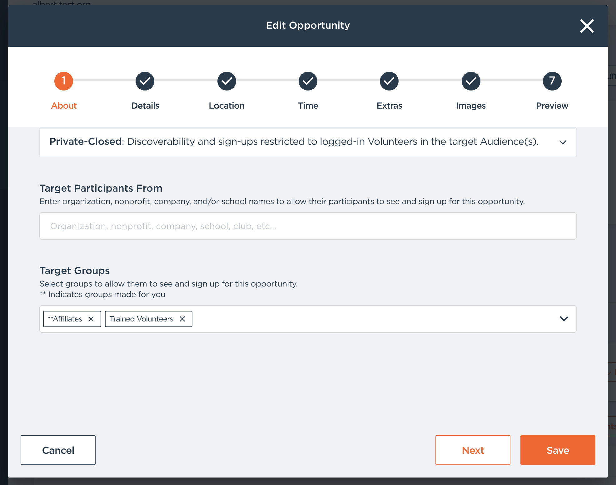 Note: You may want to set the Audience as Private-Open or Private-Closed so only your volunteers can view it. In the example below, we included our Affiliates and Registered volunteers as able to access this Opportunity.