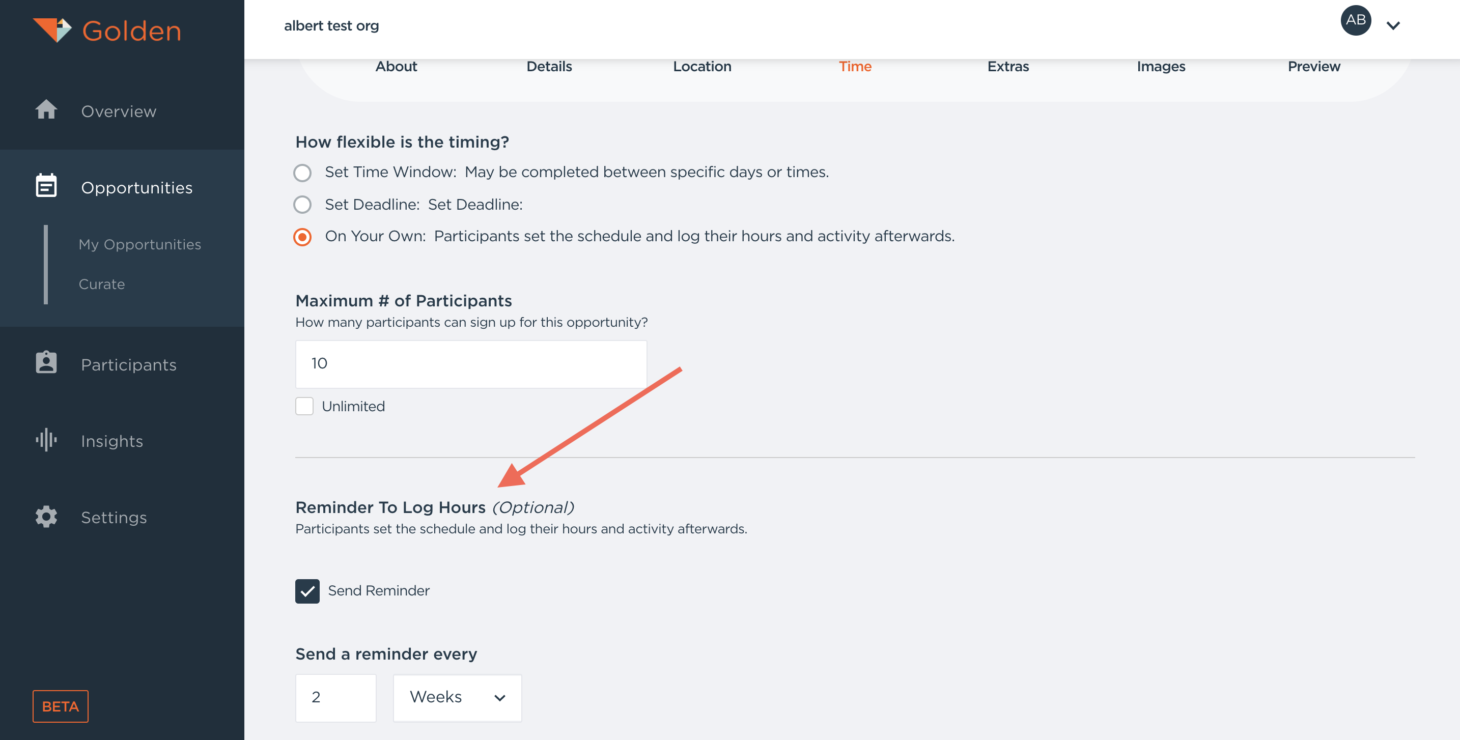 You also have the option to send reminders to your participants to help remind them to log hours. In the example below, we have chosen to remind participants every two weeks.
