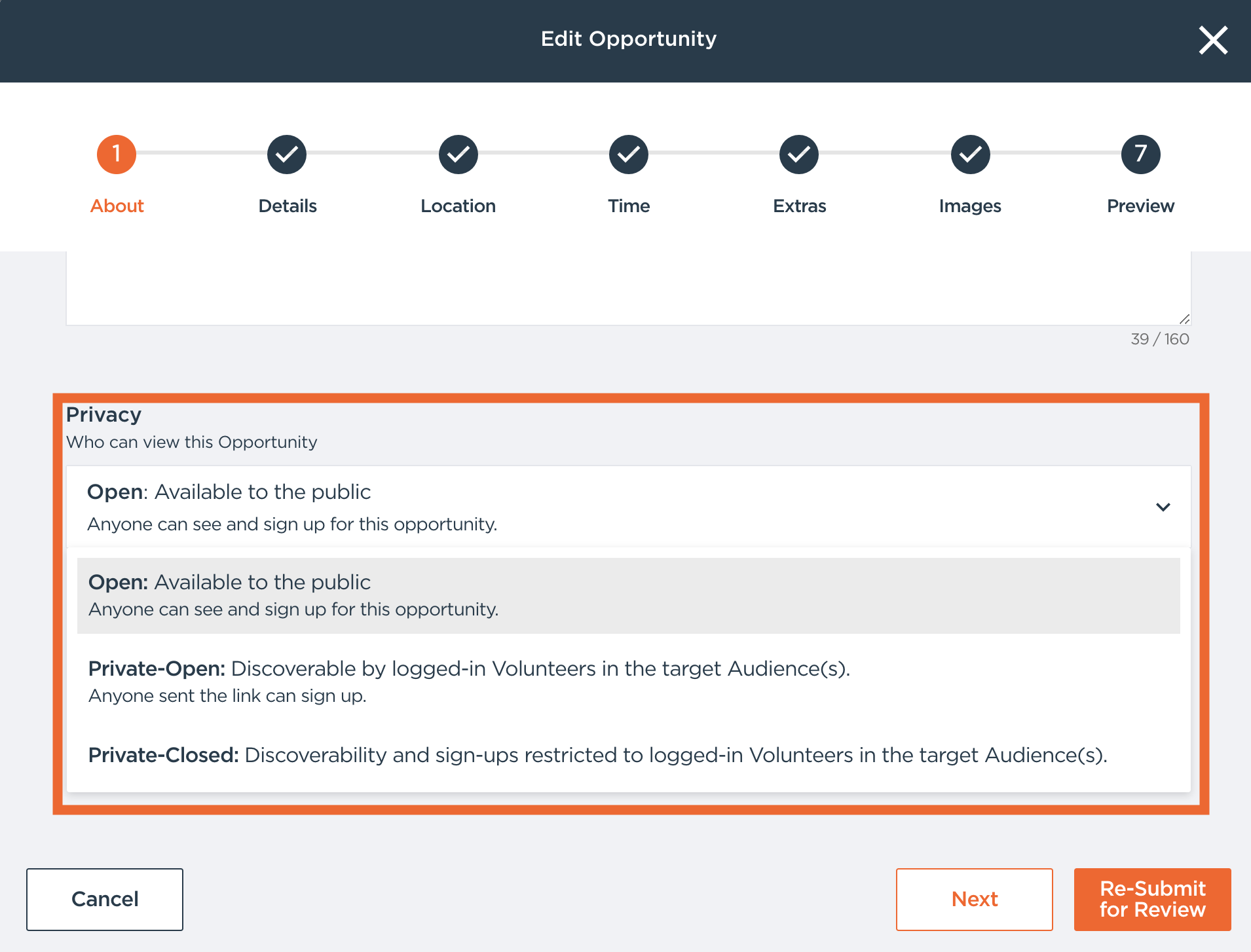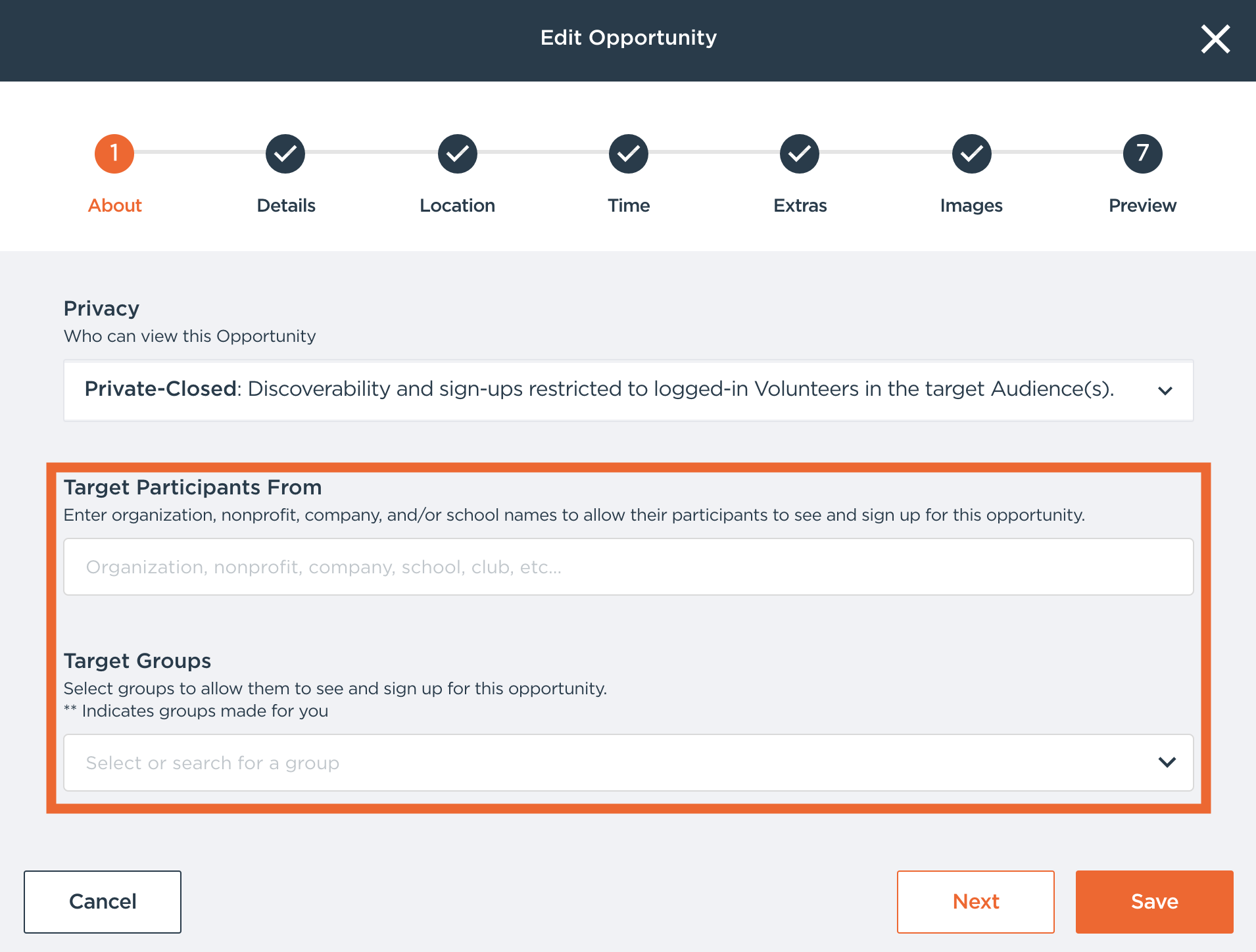 Pro-tip: if you include your own organization in the "Target Participants" section, these opportunities will be visible when volunteers use the Web Tool to show private opportunities!