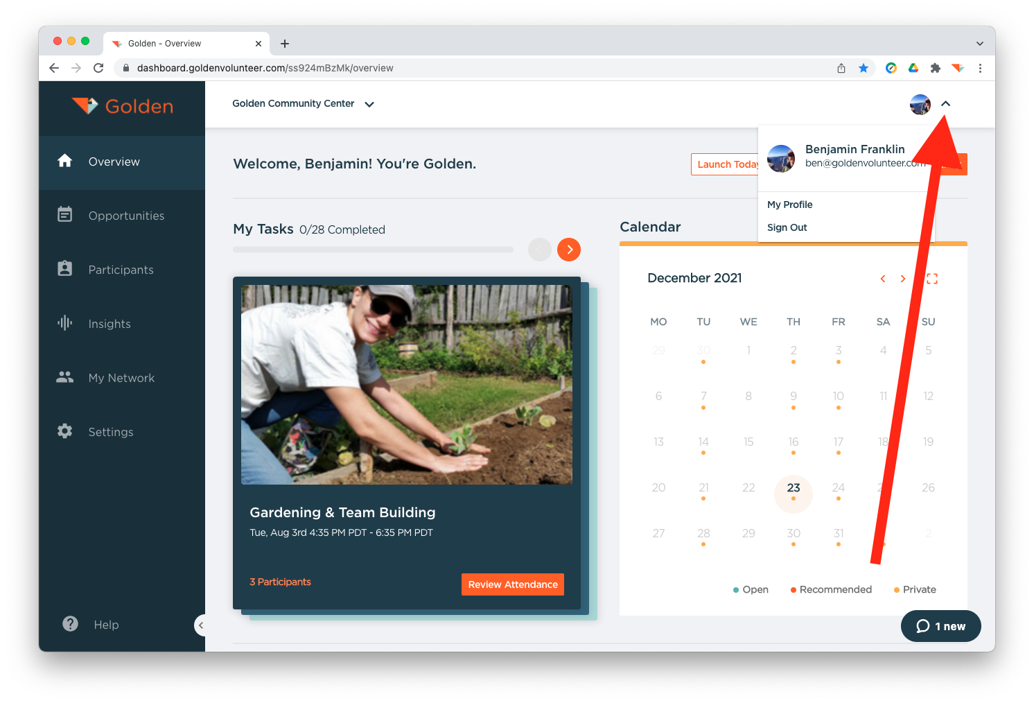 Dashboard users can access their personal profiles in the top right hand corner of the screen.