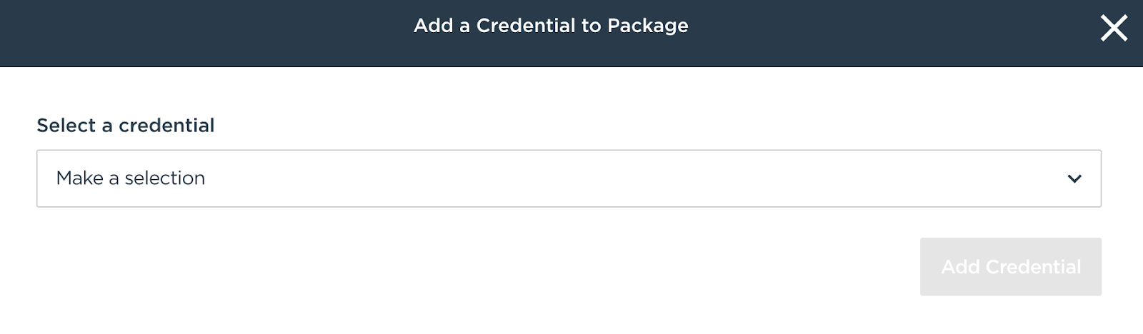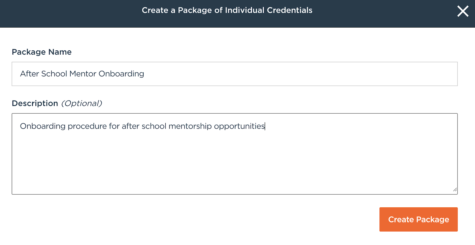 Under Manage Credentials, toggle to the Package tab and click +Create a Package. Provide a clear title and brief description, then click Create Package.