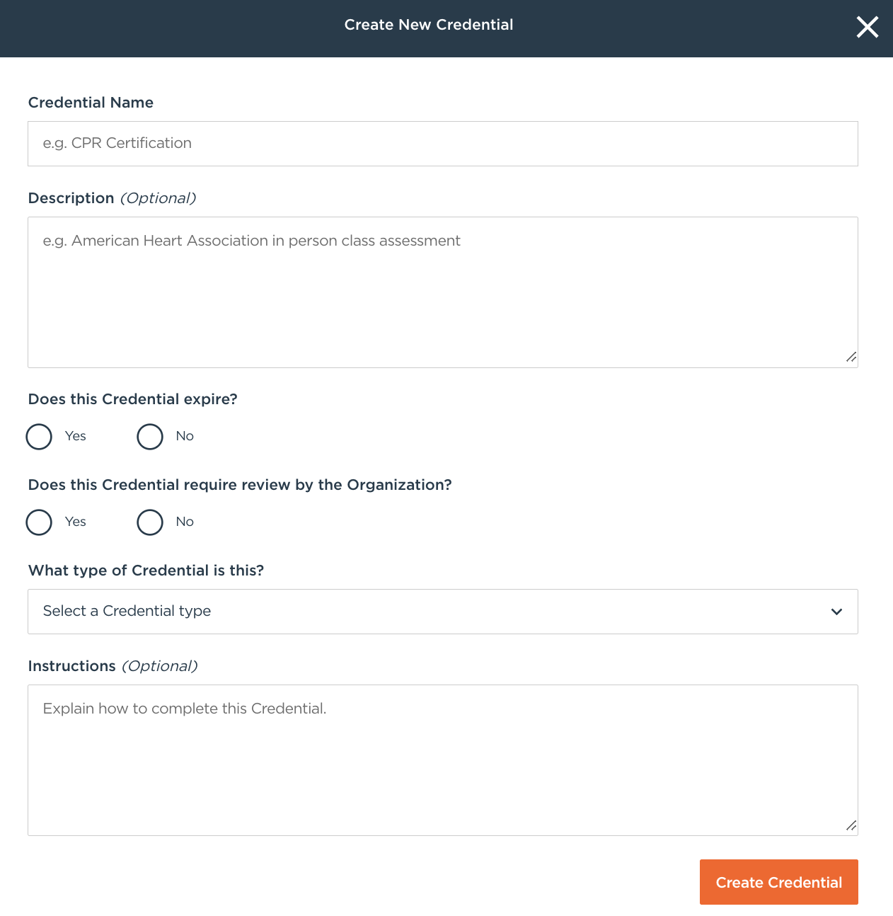 - Credential Type: Select from Form, Interview, Video, Document Upload, or Offline Process. (Note: Form credentials allow you to create custom application questions.)