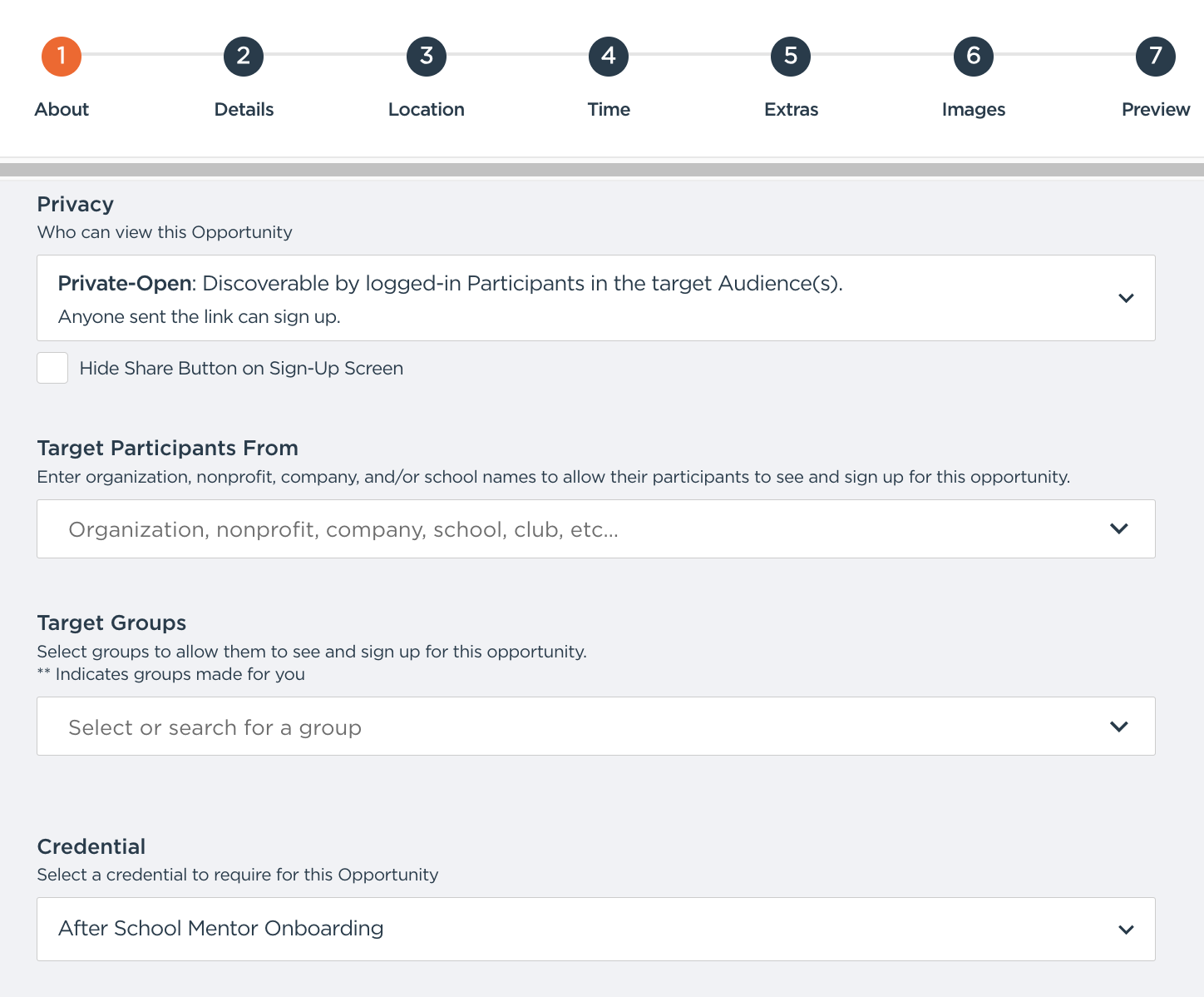 - Credential Name: Clearly name your credential (e.g., "Volunteer Mentor Application" or "Mentor Interview").